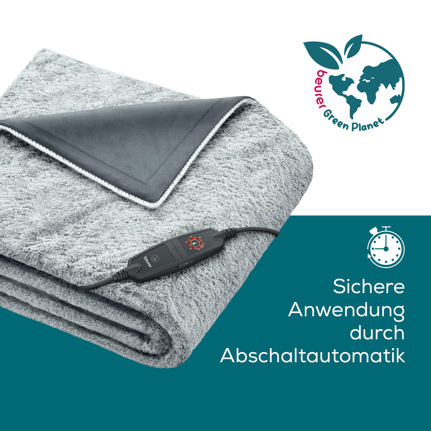 Die Wärmezudecke Nordic Grey aus der Green Planet Reihe von Beurer mit Flauschfaser-Oberfläche sorgt für kuschelige Stunden auf dem Sofa oder im Schlafzimmer. Für mehr Nachhaltigkeit besteht die Ober- und Unterseite der Wärmedecke aus 100 % und der abnehmbare Schalter aus 50 % recyceltem Material. Für ein sicheres und reines Gefühl verfügt die HD 75 Green Planet über eine Abschaltautomatik und ist waschmaschinengeeignet.